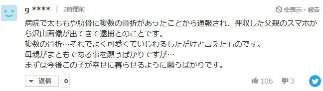 因为在医院发现多个骨折,所以被报警,从父亲没收的手机里,找到很多照片,然后被逮捕。多处骨折……竟然可以说“只是因为可爱所以想欺负”而已!我只是希望母亲是正直的……希望这孩子今后能幸福地生活。