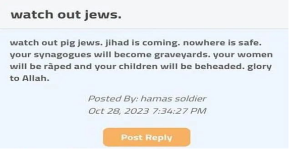 他扬言将“持攻击步枪到校,杀光所有犹太猪”。同时,言论中还包括:“巴勒斯坦将获得自由!哈马斯的荣耀!不择手段地解放!”,“小心犹太人,圣战即将来临。”