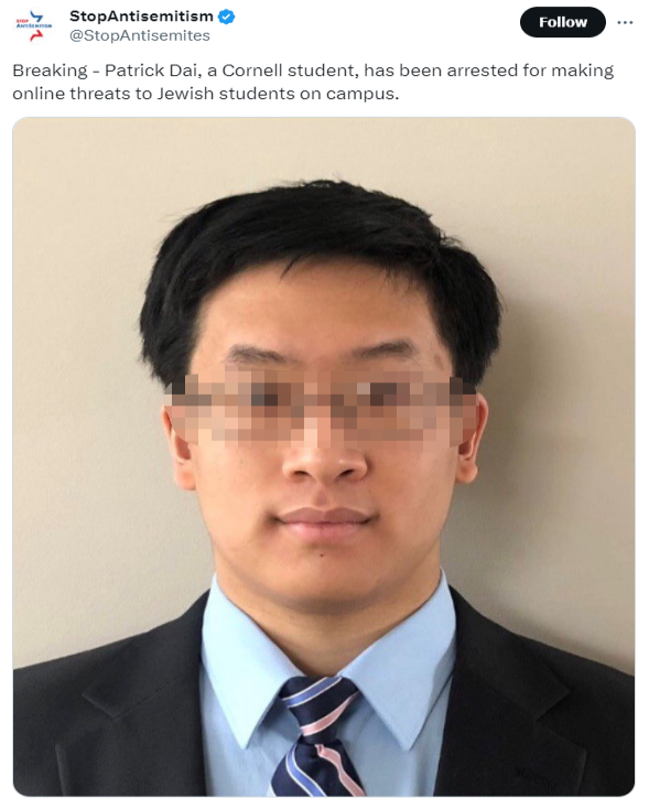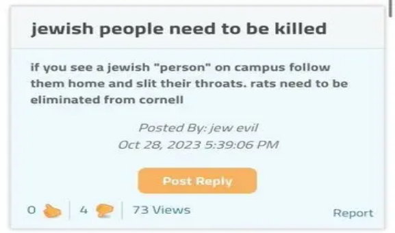 最近一段时间,康奈尔大学在网络上收到多条威胁信息,包括扬言在104 West大楼枪杀犹太学生,以及教唆伤害犹太人…