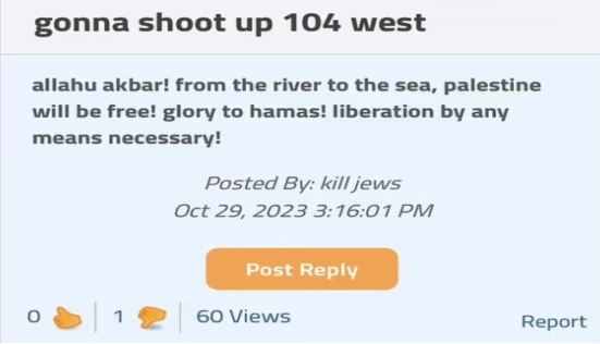 据了解104 West 是康奈尔大学的一个食堂,主要供应犹太饮食,还威胁 “要射杀 104 West “。