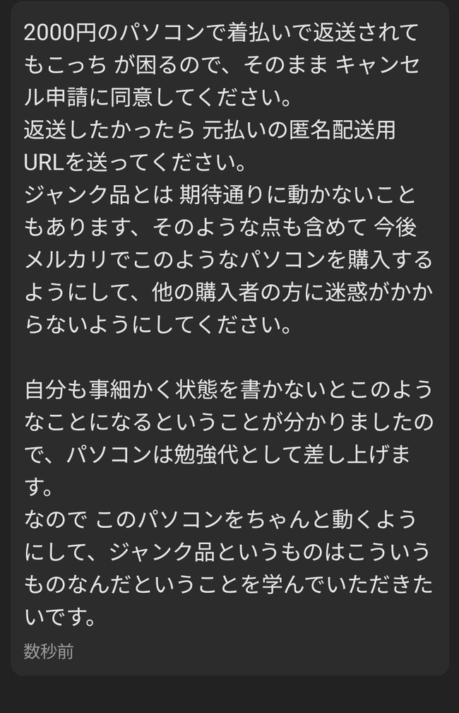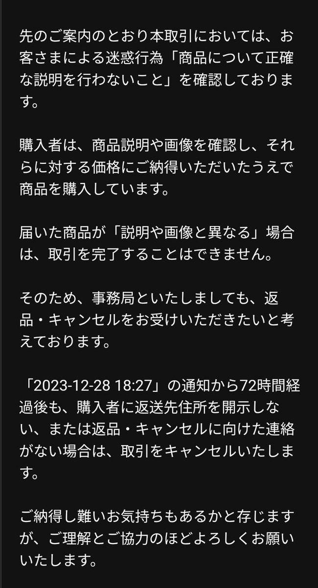 めんどくさいので 購入者に以下の文言を送ってキャンセルしました。 pic.twitter.com/dW0FOtM5fh— taki@DJしてます (@taki_pc_1115) December 28, 2023