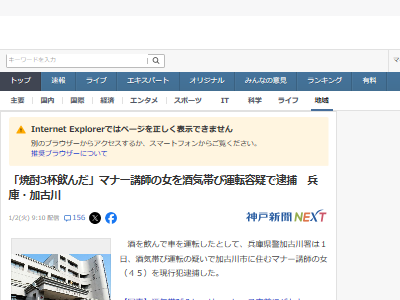 「焼酎3杯飲んだ」マナー講師の女を酒気帯び運転容疑で逮捕 兵庫・加古川(神戸新聞NEXT) – Yahoo!ニュース
