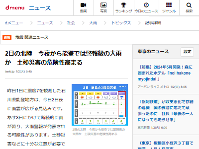 2日の北陸 今夜から能登では警報級の大雨か 土砂災害の危険性高まる(tenki.jp)|dメニューニュース(NTTドコモ)
