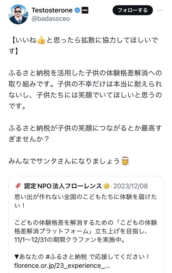 【応援📣】思い出だけじゃ生きていけないけど、楽しかった体験や思い出は、その後の人生に影響を与えたり、大人になっても心の支えになってくれる。クリスマスの日に、ふるさと納税のクラファンを通じて、子どもの笑顔を作るサンタになってみませんか?🎄🎅✨ https://t.co/jRlinYi76e