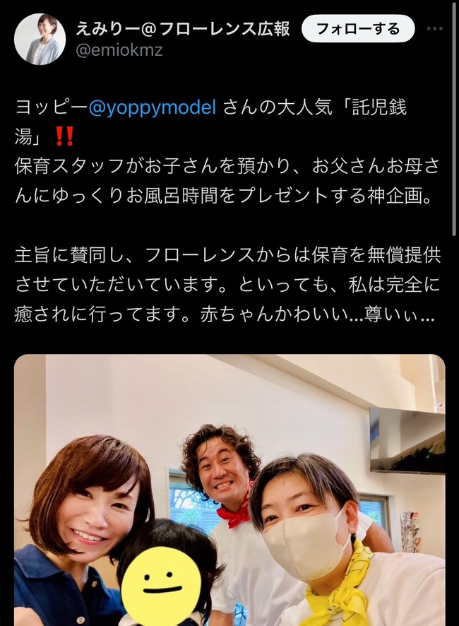 しかしヨッピー氏が運営する「託児銭湯」が、フローレンスから保育士の無償提供を受けていることが判明
