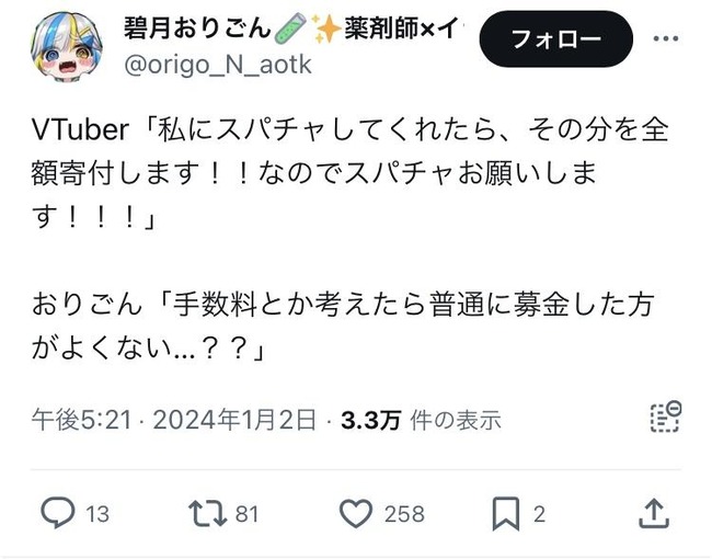 【悲報】「被災地に募金するからスパチャして!」というVTuberが現れてしまう・・・肥猫1年前发布关注私信0377 Xより ★~☆·☆.~同舟*∴*~★ © 版权声明 版权声明 1 本网站名称:华人同舟360 3 本网站的文章部分内容可能来源于网络,仅供大家学习与参考,如有侵权,请联系站长QQ3311406980进行删除处理。 4 本站一切资源不代表本站立场,并不代表本站赞同其观点和对其真实性负责。 5 本站一律禁止以任何方式发布或转载任何违法的相关信息,访客发现请向站长举报 THE END在日趣闻 喜欢就支持一下吧点赞7 分享QQ空间微博QQ好友海报分享复制链接收藏