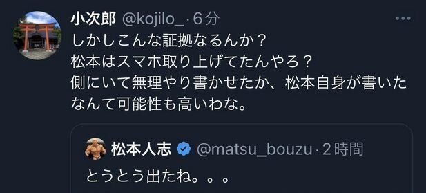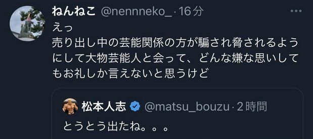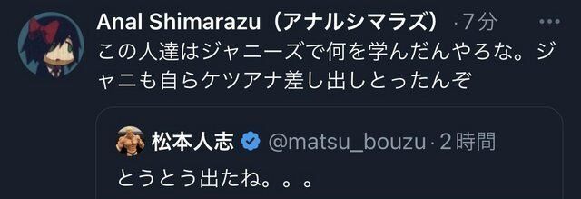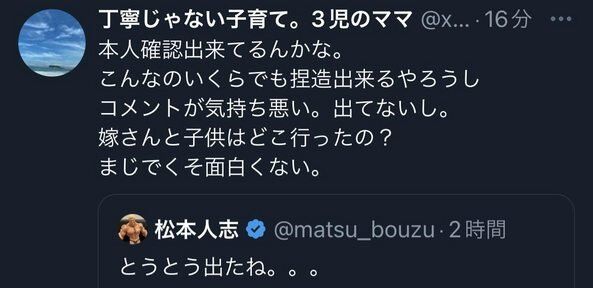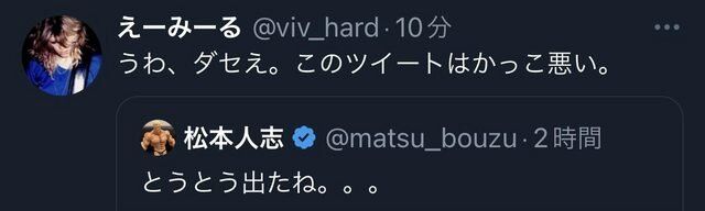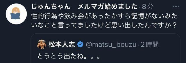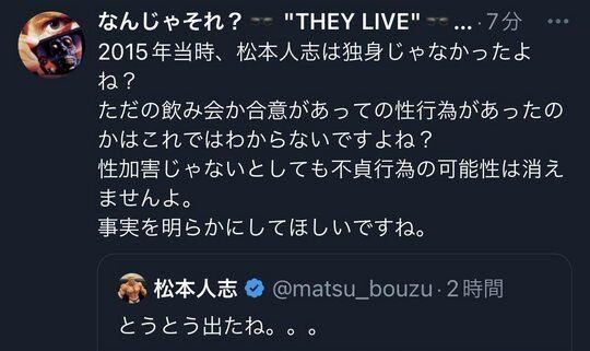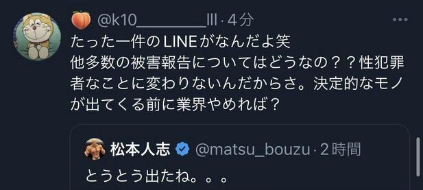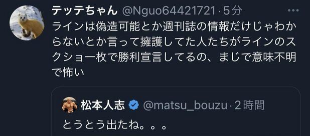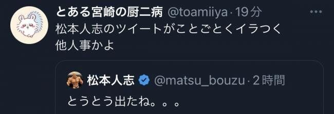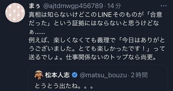 松本人志さんの勝利宣言ツイート、ガチで大炎上してしまう…momo1年前发布关注私信04414 とうとう出たね。。。 pic.twitter.com/PQtnqUIC2K — 松本人志 (@matsu_bouzu) January 5, 2024 ■ツイッターより ★~☆·☆.~同舟*∴*~★ © 版权声明 版权声明 1 本网站名称:华人同舟360 3 本网站的文章部分内容可能来源于网络,仅供大家学习与参考,如有侵权,请联系站长QQ3311406980进行删除处理。 4 本站一切资源不代表本站立场,并不代表本站赞同其观点和对其真实性负责。 5 本站一律禁止以任何方式发布或转载任何违法的相关信息,访客发现请向站长举报 THE END在日趣闻 喜欢就支持一下吧点赞14 分享QQ空间微博QQ好友海报分享复制链接收藏