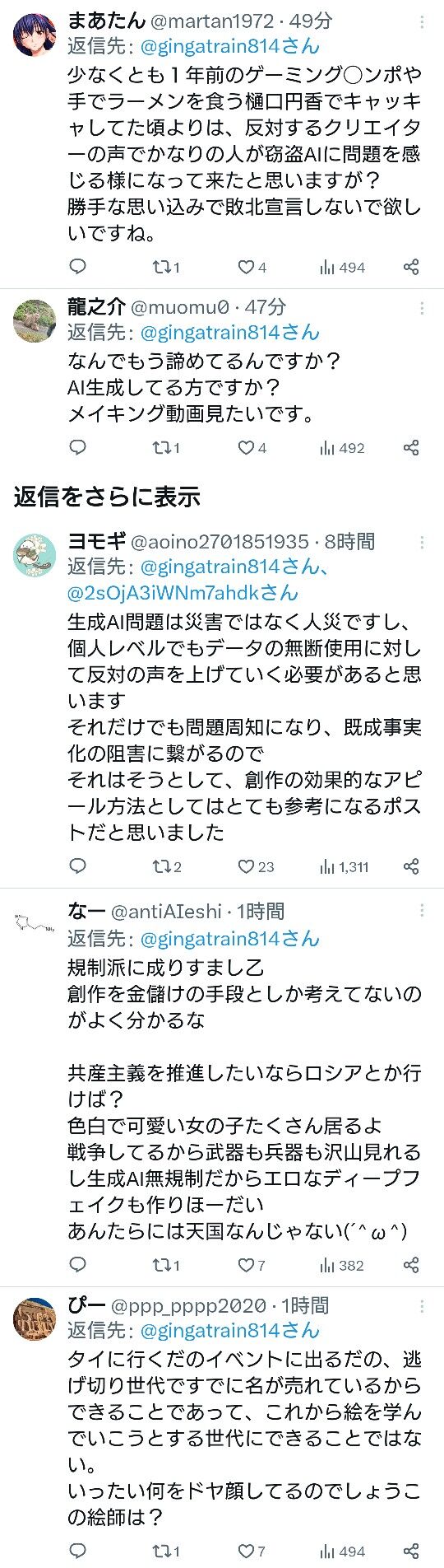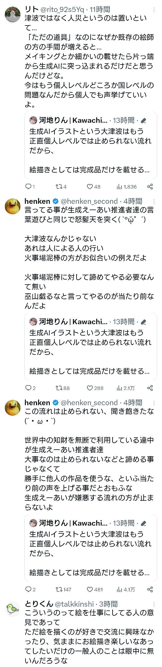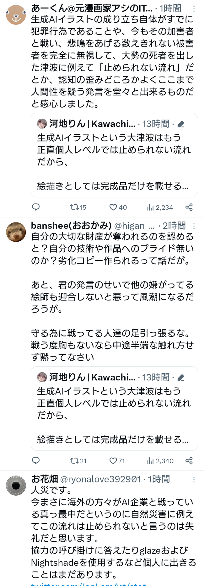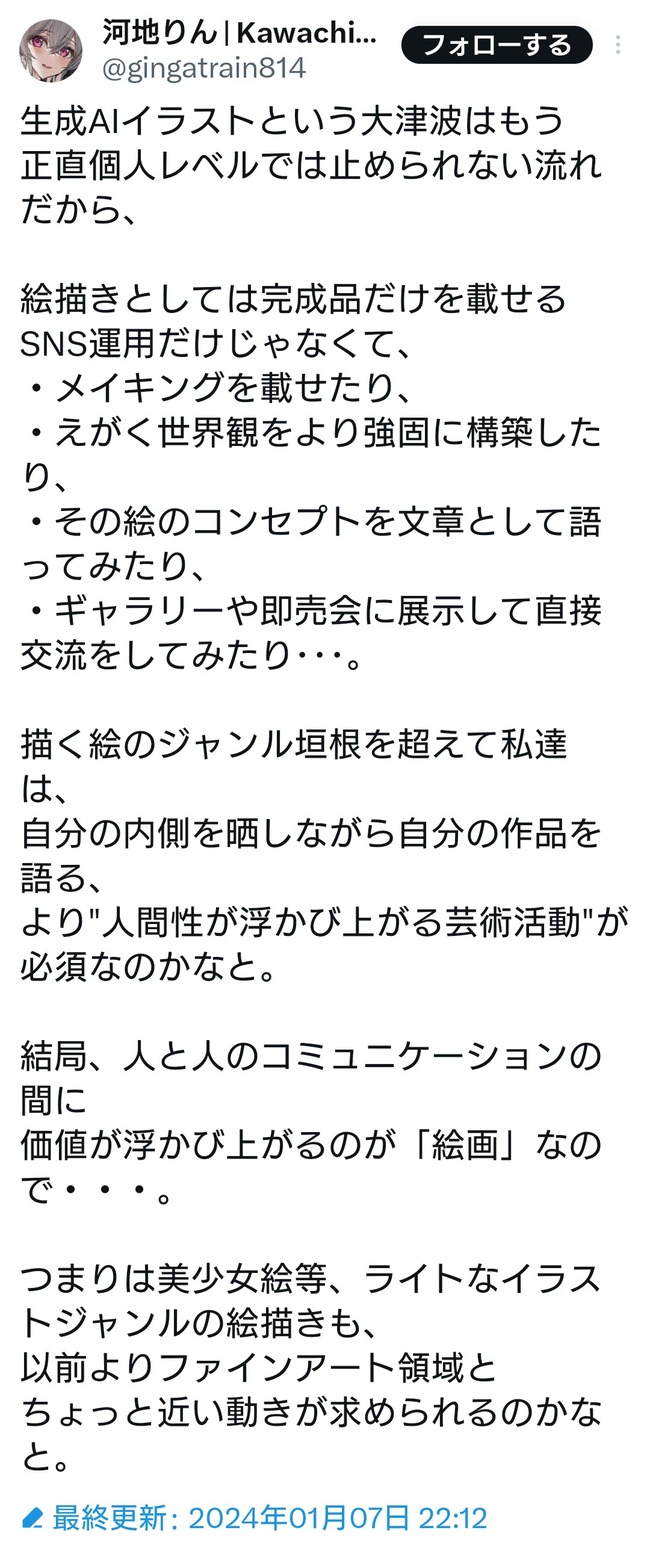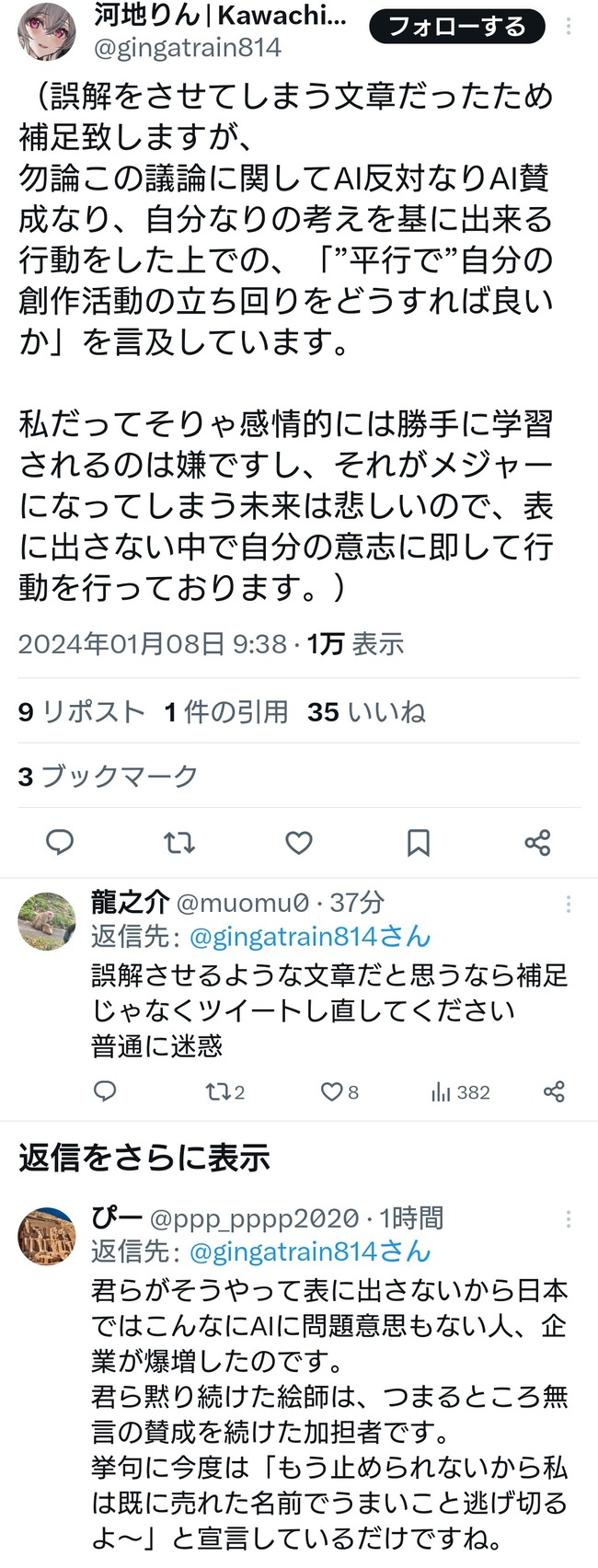 勿論この議論に関してAI反対なりAI賛成なり、自分なりの考えを基に出来る行動をした上での、「”平行で”自分の創作活動の立ち回りをどうすれば良いか」を言及しています。…— 河地りん | Kawachi Rin (@gingatrain814) January 8, 2024
