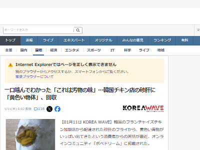 一口噛んでわかった「これは汚物の味」…韓国チキン店の砂肝に「黄色い物体」、回収