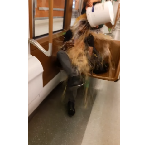 その内容は、バケツに食物、枯れ葉、油、犬の糞などを混ぜ合わせ、その混合液を地下鉄の乗客に頭からぶっかけるという悪質ないたずら。