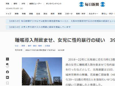 2018〜22年に北海道に住む当時13歳未満の女児に睡眠導入剤を飲ませて性的暴行を行ったなどとして、北海道警は15日、39〜55歳の男性5人を強制わいせつなどの疑いで逮捕したと発表した