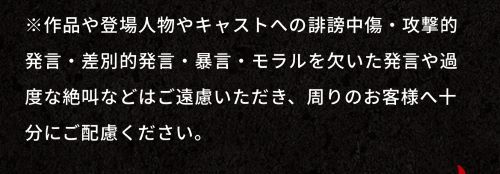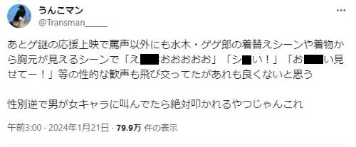 あとゲ謎の応援上映で罵声以外にも水木・ゲゲ郎の着替えシーンや着物から胸元が見えるシーンで「え■■おおおおお」「シ■い!」「お■■い見せてー!」等の性的な歓声も飛び交ってたがあれも良くないと思う