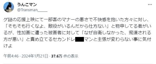 ゲ謎の応援上映にて一部客のマナーの悪さで不快感を抱いた方々に対し、「そもそも行くなよ、敵役がいるんだから仕方ない」と物申してる者がいるが、性加害に遭った被害者に対して「なぜ自衛しなかった、痴漢される方が悪い」と責め立てるセカンドレイプマンと主張が変わらない事に気付けよ
