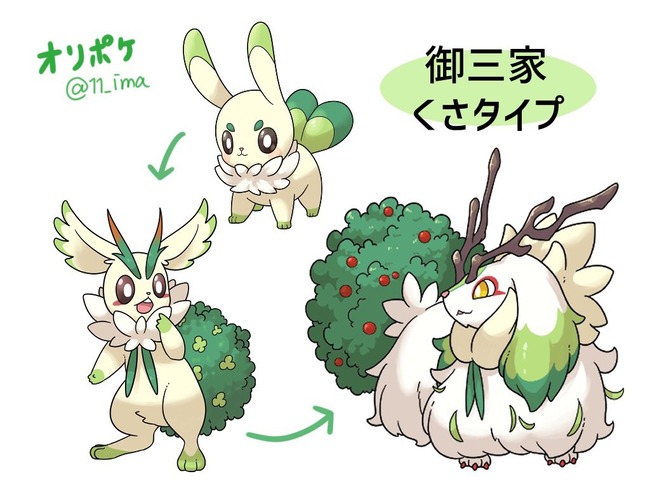 オリポケくさ御三家リメイク完了。最終的にフェアリー複合のアンゴラウサギ+ジャッカロープがモチーフのもさもさウサギに。
