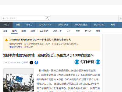 能登半島地震の被災地 避難所などに防犯カメラ1000台設置へ(毎日新聞) – Yahoo!ニュース