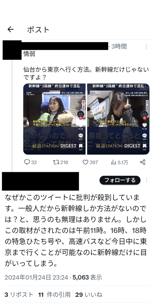 【悲報】鉄オタさん、新幹線が止まりディズニーランドに行けなかった親子を「情弱」呼ばわりしてしまうmomo1年前发布关注私信02610 ■Xより 親子の取材シーン 5:12〜 ★~☆·☆.~同舟*∴*~★ © 版权声明 版权声明 1 本网站名称:华人同舟360 3 本网站的文章部分内容可能来源于网络,仅供大家学习与参考,如有侵权,请联系站长QQ3311406980进行删除处理。 4 本站一切资源不代表本站立场,并不代表本站赞同其观点和对其真实性负责。 5 本站一律禁止以任何方式发布或转载任何违法的相关信息,访客发现请向站长举报 THE END在日趣闻 喜欢就支持一下吧点赞10 分享QQ空间微博QQ好友海报分享复制链接收藏