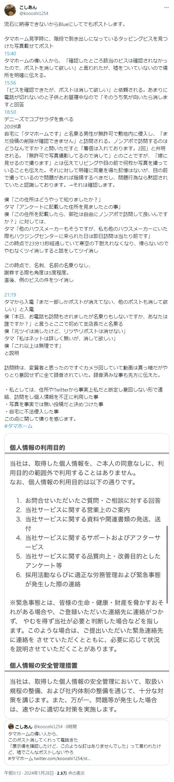 自宅前にタマホームの偉い人が立っていて「まだツイート消してもらえないから、削除のお願いに来ました」と勝手に敷地に入って来た