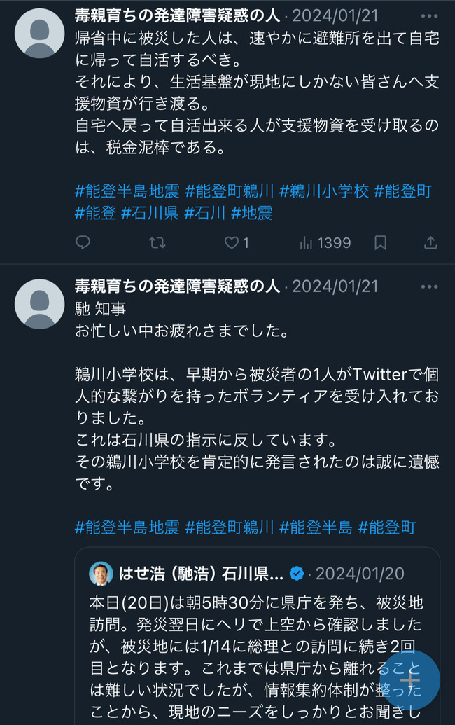 謎の集団が「なちゃんはパパ活して物資をもらってる」「個人物資をもらうのは石川県の方針に逆らっている」と中傷