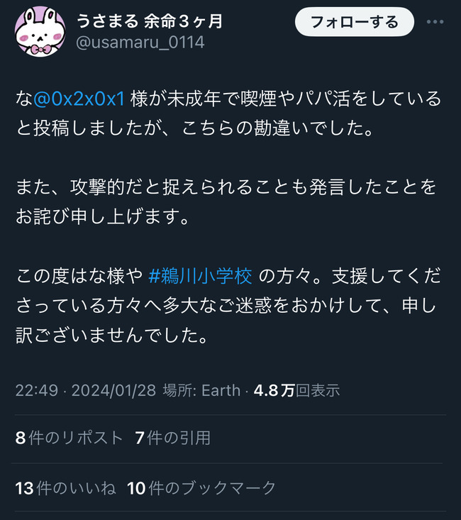 バッシング犯が陳謝