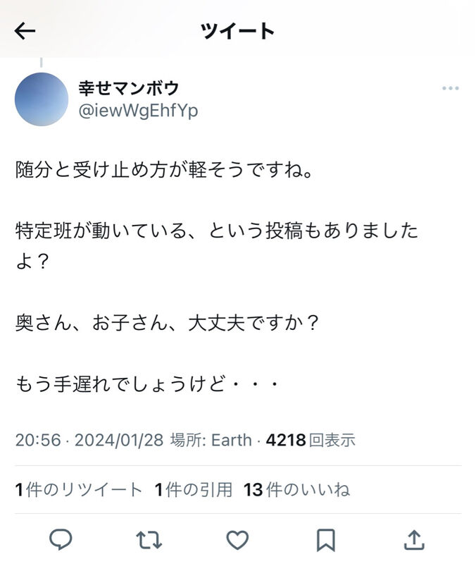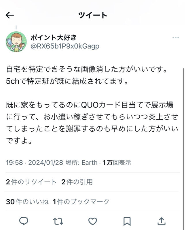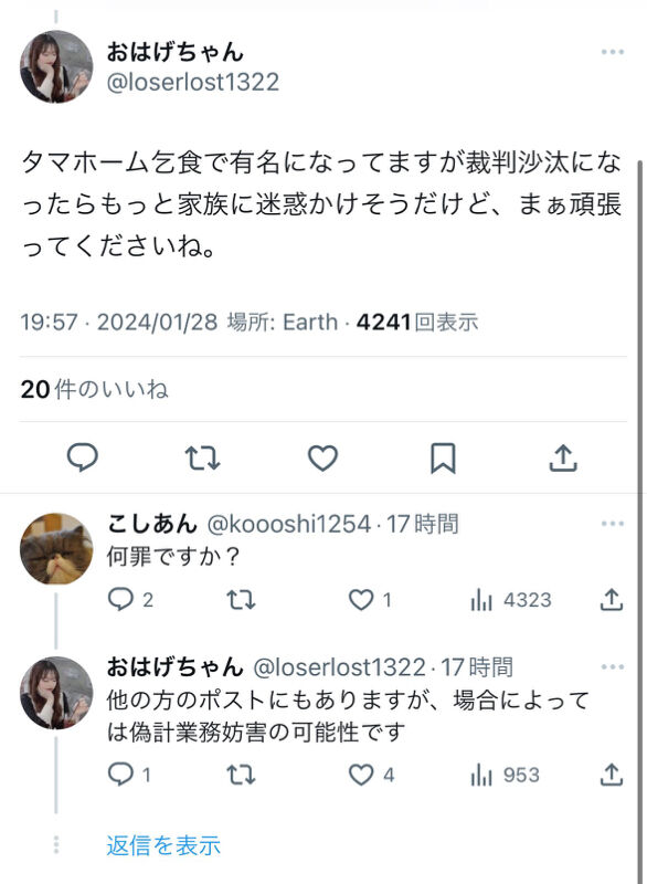 タマホームの失態を晒して、タマホームに突撃され、削除要求された人、なぜか「特定班いるよ?大丈夫?もう手遅れでしょうけど」と脅迫されてしまうmomo1年前发布关注私信02811 ■ツイッターより ★~☆·☆.~同舟*∴*~★ © 版权声明 版权声明 1 本网站名称:华人同舟360 3 本网站的文章部分内容可能来源于网络,仅供大家学习与参考,如有侵权,请联系站长QQ3311406980进行删除处理。 4 本站一切资源不代表本站立场,并不代表本站赞同其观点和对其真实性负责。 5 本站一律禁止以任何方式发布或转载任何违法的相关信息,访客发现请向站长举报 THE END在日趣闻 喜欢就支持一下吧点赞11 分享QQ空间微博QQ好友海报分享复制链接收藏