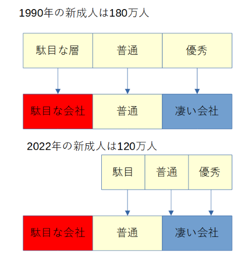 新成人の数に合わせて企業の受け入れ人数が減ってないなら、どうしたってこうなる。Z世代が劣っているわけではまったくない。