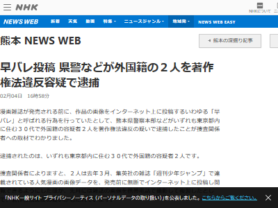 漫画雑誌が発売される前に、作品の画像をインターネット上に投稿するいわゆる「早バレ」と呼ばれる行為を行っていたとして、熊本県警察本部などがいずれも東京都内に住む30代で外国籍の容疑者2人を著作権法違反の疑いで逮捕したことが捜査関係者への取材でわかりました。