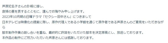日テレさん、原作改変騒動があった「セクシー田中さん」の作者・芦原妃名子さんの訃報にコメント→あまりにもやばすぎて批判殺到
