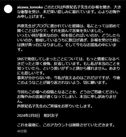 脚本家・相沢友子氏「芦原先生がブログに書かれていた経緯は、私にとっては初めて聞くことばかりで、それを読んで言葉を失いました。」