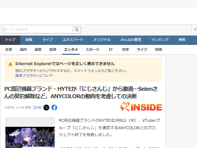 PC周辺機器ブランド・HYTEが「にじさんじ」から撤退…Selenさんの契約解除など、ANYCOLORの動向を考慮しての決断(インサイド) – Yahoo!ニュース