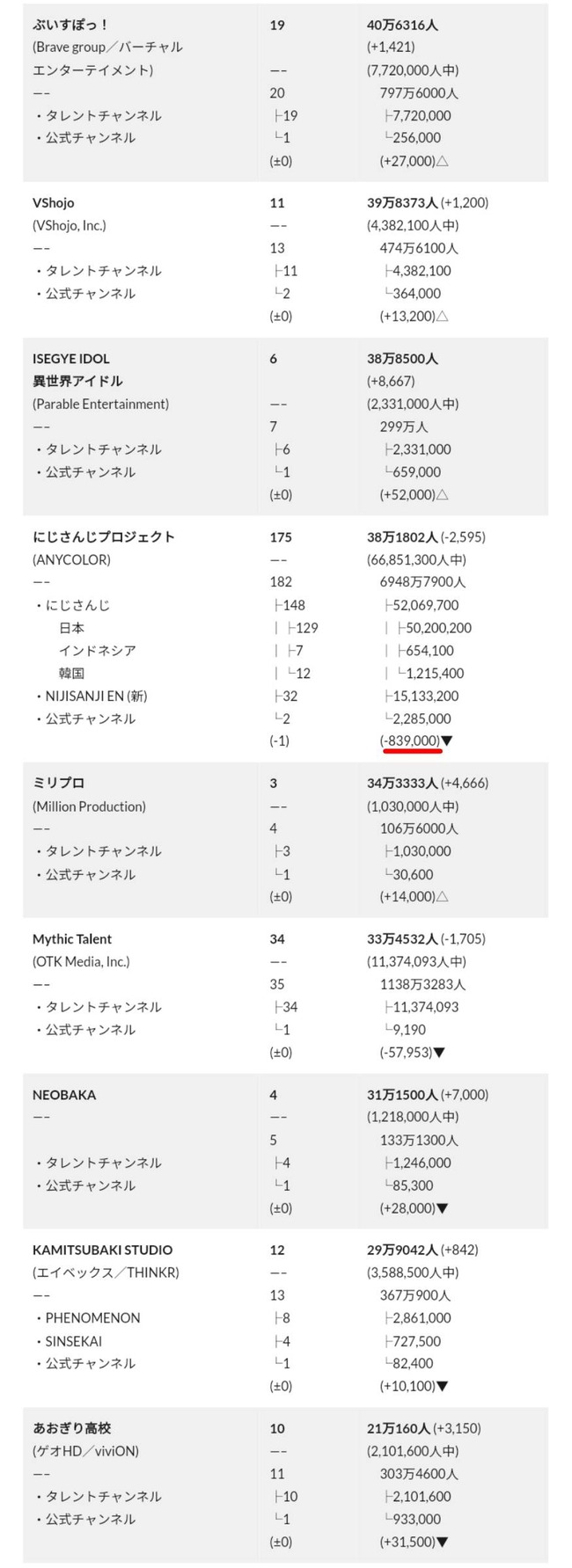 炎上中のにじさんじ、事務所全体の登録者数が減りまくってヤバい「一週間で山梨県分の人口が消えた」momo1年前发布关注私信02210 VTuber YouTubeチャンネル登録者数情報 事務所・グループ別平均 2024年2月11日 VTuberチャンネル登録者数 (1週前比増減) にじさんじプロジェクト -839,000 ★~☆·☆.~同舟*∴*~★ © 版权声明 版权声明 1 本网站名称:华人同舟360 3 本网站的文章部分内容可能来源于网络,仅供大家学习与参考,如有侵权,请联系站长QQ3311406980进行删除处理。 4 本站一切资源不代表本站立场,并不代表本站赞同其观点和对其真实性负责。 5 本站一律禁止以任何方式发布或转载任何违法的相关信息,访客发现请向站长举报 THE END在日趣闻 喜欢就支持一下吧点赞10 分享QQ空间微博QQ好友海报分享复制链接收藏