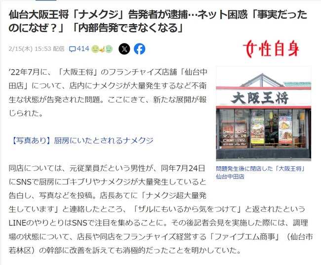 仙台大阪王将「ナメクジ」告発者が逮捕…ネット困惑「事実だったのになぜ?」「内部告発できなくなる」
