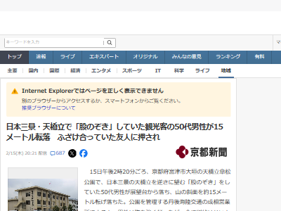日本三景・天橋立で「股のぞき」していた観光客の50代男性が15メートル転落 ふざけ合っていた友人に押され(京都新聞) – Yahoo!ニュース