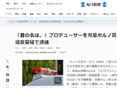 「君の名は。」プロデューサーを児童ポルノ禁止法違反容疑で逮捕 | 毎日新聞