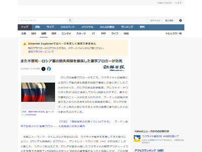 米紙ニューヨーク・タイムズなど外信は21日、ウクライナ戦争を支持してきた親クレムリン(ロシア大統領府)のブロガー、アンドレイ・モロゾフ氏(44)が同日死亡したと報じた。モロゾフ氏は先ごろ、ロシアが最近占領したウクライナの都市アウディーイウカを攻撃する過程で1万6000人の兵力と300台の装甲車を失ったと投稿したが、これが問題視されたようだ。アウディーイウカは今回の戦争で最大の激戦地の一つだったが、17日にウクライナの軍隊が作戦上の理由で撤退したため、ロシア軍が掌握するに至った。