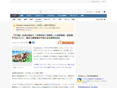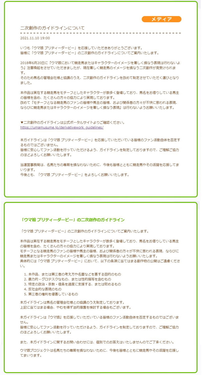 Cygamesは、ウマ娘のキャラクターを利用した不適切な二次創作を確認しているとして、改めてガイドラインの遵守を求めています。