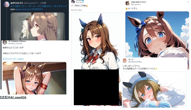 しかもウマ娘二次創作関連で胸糞だったのが、絵柄パクられたウマ娘絵師さんが、ウマエロAIイラストの絵柄から冤罪を吹っかけられて炎上した事よ
