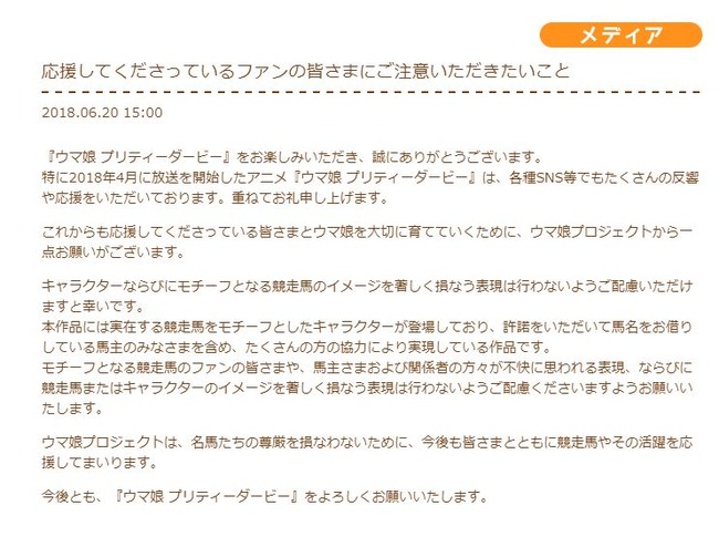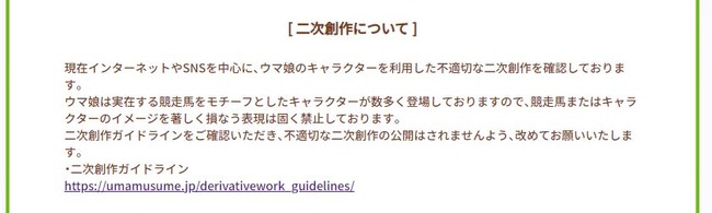 実在する競走馬をモチーフとしたキャラクターが活躍する本作では、競走馬またはキャラクターのイメージを著しく損なう表現を含む二次創作を固く禁止しています。