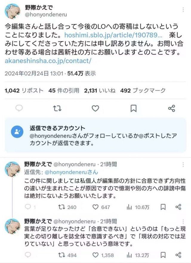 別のLO作家が「今後LOへは寄稿しない」と言及し内乱状態へ