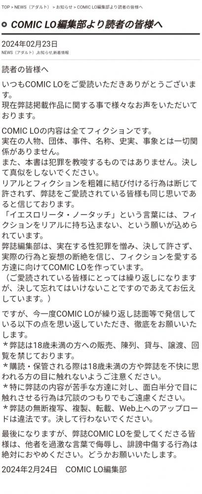 『コミックLO』が声明を出すも、『砂漠』への批判が無いことで批判殺到