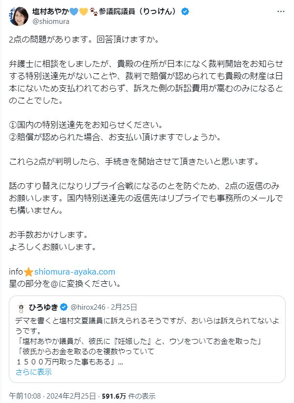 国内の貴殿の会社に特別送達を送りますので、受領ください。… https://t.co/15P5s6epzA pic.twitter.com/ryDzzhbwZJ— 塩村あやか💙💛🐾参議院議員(りっけん) (@shiomura) February 26, 2024