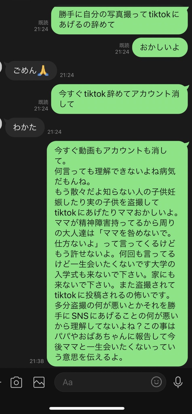 え?今さtiktokを適当にスクロールしてたら急に自分が出てきて(しかも盗撮)凄い怖くなって自分を盗撮してtiktokにあげてるアカウント見たら自分の母親だったマジでありえないおかしいほんとに本気で殺したくなった障害者が普通に暮らしてんなよ
