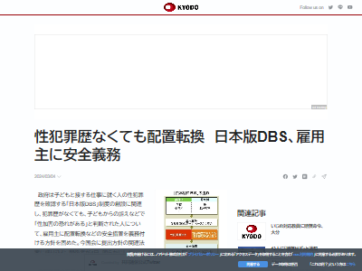 政府は子どもと接する仕事に就く人の性犯罪歴を確認する「日本版DBS」制度の創設に関連し、犯罪歴がなくても、子どもからの訴えなどで「性加害の恐れがある」と判断された人について、雇用主に配置転換などの安全措置を義務付ける方針を固めた。今国会に提出方針の関連法案に盛り込む。関係者が4日、明らかにした。