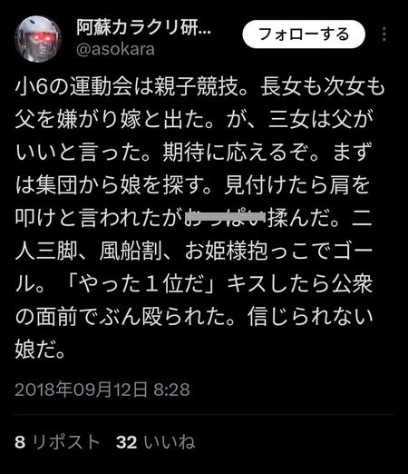 【アカン…】娘のランドセルを背負って炎上した父親、過去ツイートから娘に性的虐待してる疑惑が浮上momo1年前发布关注私信02213 ■Xより ★~☆·☆.~同舟*∴*~★ © 版权声明 版权声明 1 本网站名称:华人同舟360 3 本网站的文章部分内容可能来源于网络,仅供大家学习与参考,如有侵权,请联系站长QQ3311406980进行删除处理。 4 本站一切资源不代表本站立场,并不代表本站赞同其观点和对其真实性负责。 5 本站一律禁止以任何方式发布或转载任何违法的相关信息,访客发现请向站长举报 THE END在日趣闻 喜欢就支持一下吧点赞13 分享QQ空间微博QQ好友海报分享复制链接收藏
