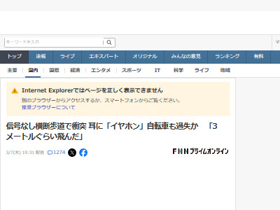 信号なし横断歩道で衝突 耳に「イヤホン」自転車も過失か 「3メートルぐらい飛んだ」(FNNプライムオンライン(フジテレビ系)) – Yahoo!ニュース