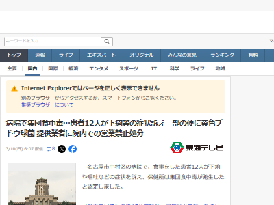 病院で集団食中毒…患者12人が下痢等の症状訴え一部の便に黄色ブドウ球菌 提供業者に院内での営業禁止処分